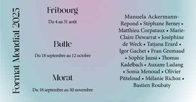 L'exposition Format Mondial, après avoir envahi les rues de Fribourg durant le mois d'août, déménage à Bulle (Jardin de l'institut Ste-Croix)du 18 septembre au 12 octobre et Morat du 18 septembre au 30 novembre.
